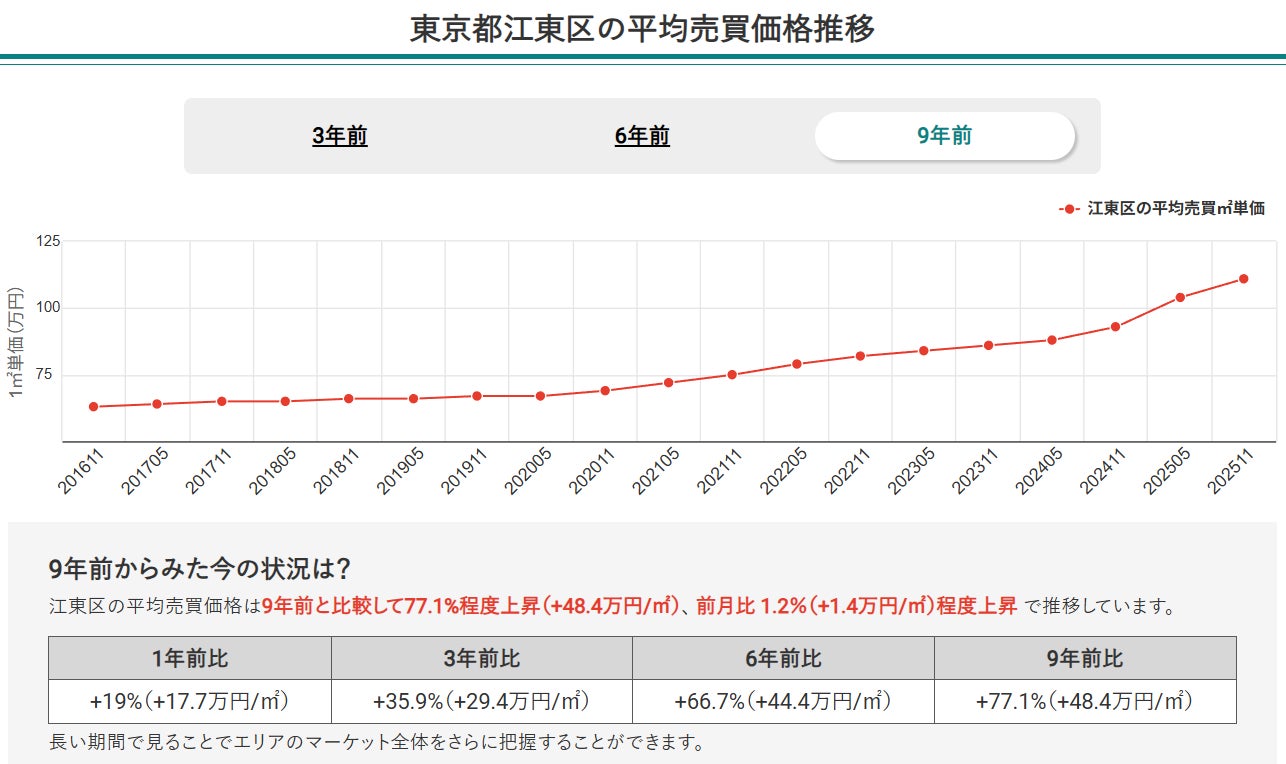 2025年11月時点での東京都全体の中古マンション平均売買平米単価は110万円で、9年前と比べて44.8万円増加しています。