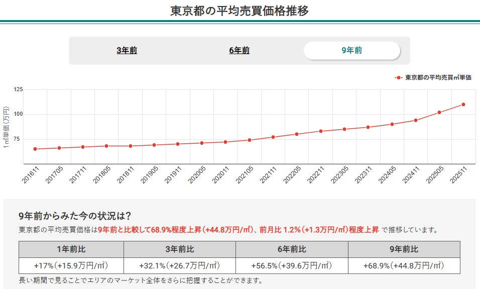 2.2025年11月時点での東京都全体のマンション価格は9年前と比較して68.9%上昇し、堅調な右肩上がりが継続
