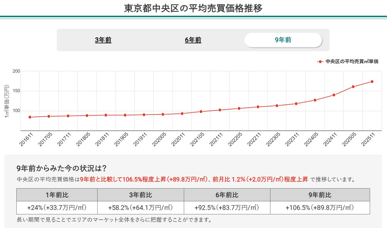 9年前と比較した平均売買価格は、中央区106.5%、江東区77.1%、台東区62.5% の上昇率を記録しており、城東エリア全体の価格押し上げに大きく寄与しています。