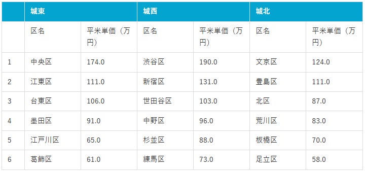 ただし、エリア内では区ごとに価格傾向が大きく異なり、都心直結の中央区の平米単価は174万円、湾岸開発の進む江東区の平米単価は111万円、上野・浅草を抱える台東区の平米単価は106万円と高い水準を形成しています。
