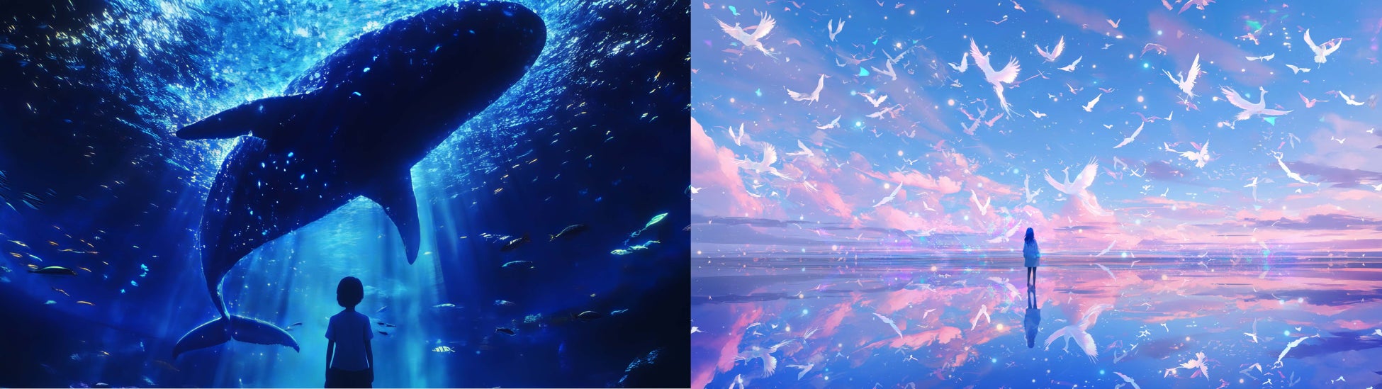 例えば、ゾーン2「ダイブ・トゥ・ブルー」は深海が舞台となり、海面上空からダイブし深海のディープ・ブルーへ潜っていく体験を提供します。また、ゾーン5「大空に舞う」では、空が反射する湖から大空への転換が描かれます。 (2つのゾーンのクリエイティブを横組みする)