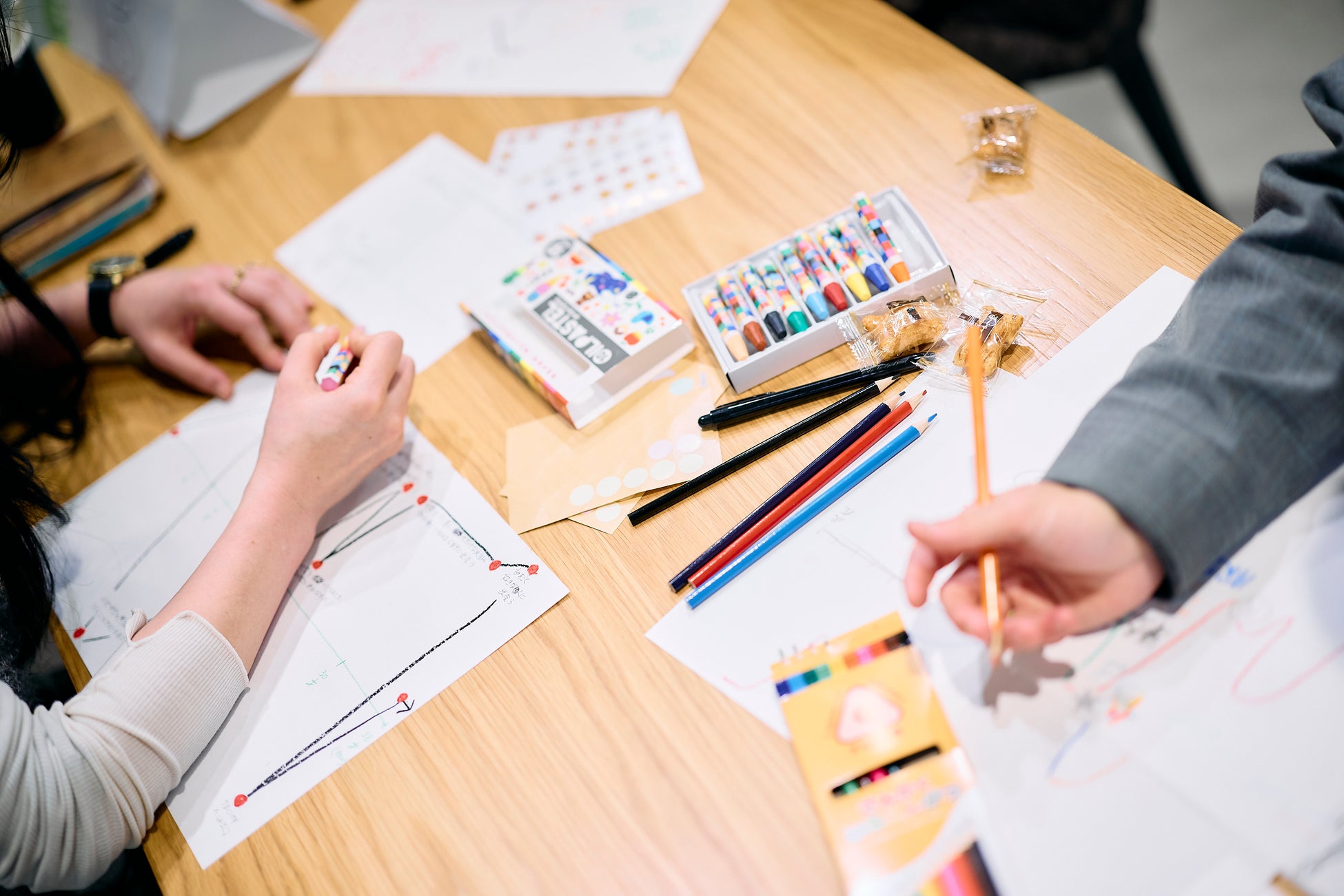 無意識に決められた“答え”を探してしまう、凝り固まった思考パターンから抜け出すヒントを見つけるためのワークショップです。グループでしりとりをし、“偶然”にでた言葉を組み合わせて、新たな商品/サービスのアイデアを考えるというゲームをしながら、自分の中に眠っている自分だけの考え方(“ズレ”“クセ”)を見つけ→愛でる→解放するまでの感覚を掴んでいただきます。