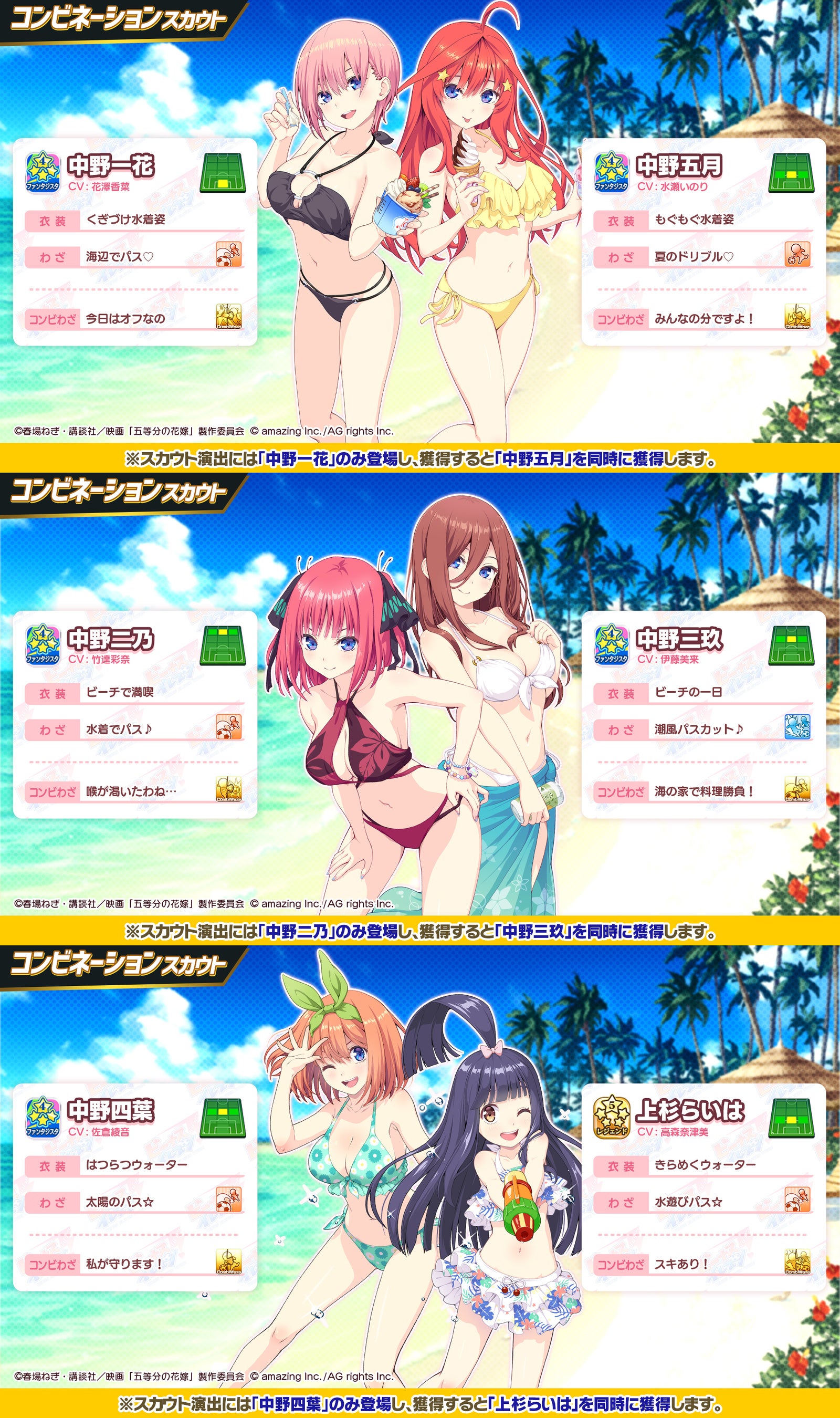 「中野一花」、「中野五月」コンビ、「中野二乃」、「中野三玖」コンビ、「中野四葉」、「上杉らいは」コンビを手に入れることができます!
