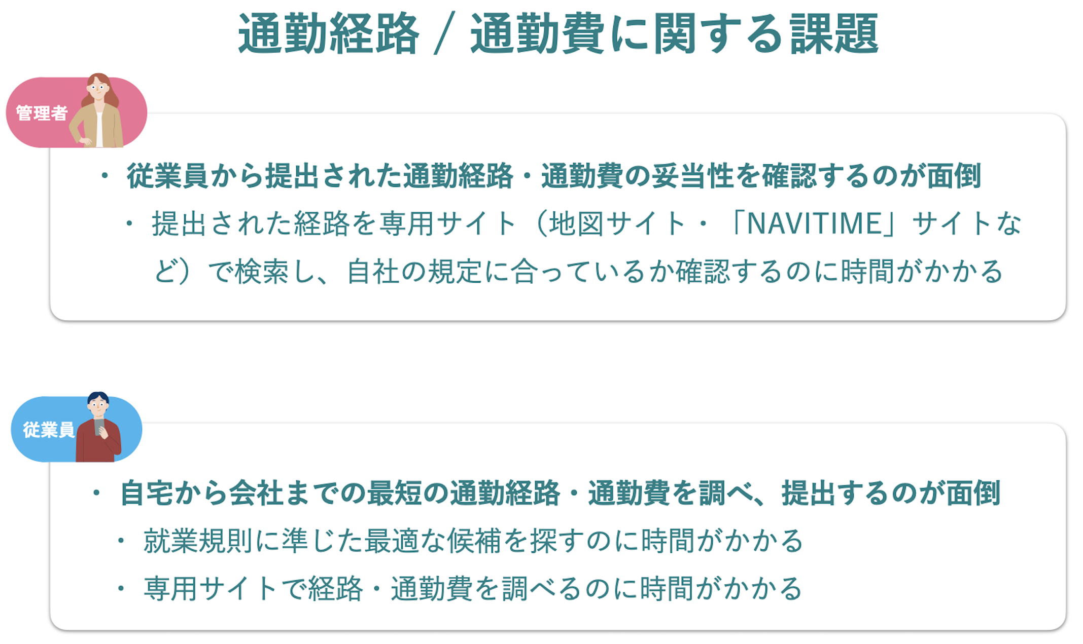 従業員から提出される通勤用の経路や従業員ごとの通勤費の妥当性の確認は、人事・労務担当者にとって時間と手間がかかる非効率な作業であり、長年課題として挙げられていました。