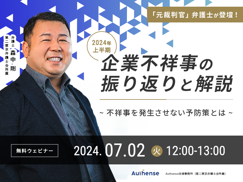 【無料ウェビナー開催2024.7.2】「元裁判官」弁護士が登壇!今年はどんな企業不祥事が起こったのか? 企業不祥事を発生させない予防策とは?