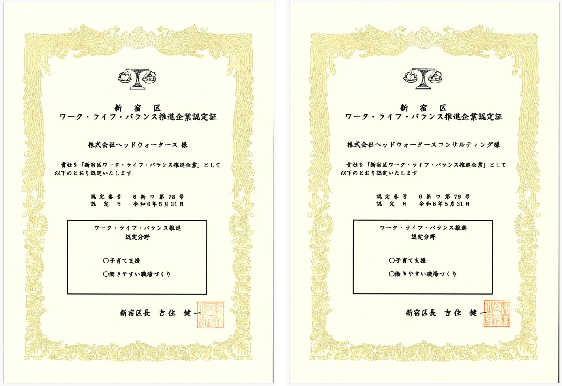 ヘッドウォータース、ヘッドウォータースコンサルティングが「新宿区ワーク・ライフ・バランス推進企業」に認定されました