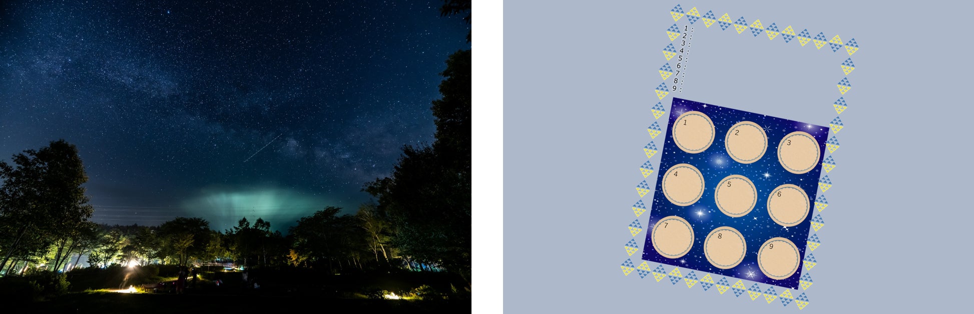 お子様向けに、星座を探してビンゴカードを埋める「星座探しビンゴ」を開催いたします。ビンゴを達成したお子様には素敵な景品をご用意しております。「自分の誕生月の星座はどこにあるのだろう?」「知っている星座はどんな形をしているの?」多くの星が輝く浪合パークなら星座も見つけられるかもしれません。