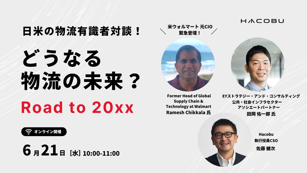この度、Hacobuでは、皆さんと共に、中長期的における「物流の未来」を考える場をご用意しました。米ウォルマートの元CIOにて、サプライチェーンとテクノロジーのチームを率いたRamesh Chikkala氏が米国から緊急登壇。さらに、EYストラテジー・アンド・コンサルティングで運輸・物流インダストリーをリードするアソシエートパートナー田岡 佑一郎 氏 をゲストにお迎えし、Hacobu 執行役員CSO 佐藤 健次との3名で、最新の米物流Techを読み解きながら、日本のロジスティクスの未来について、皆さんと共に考えてまいります。