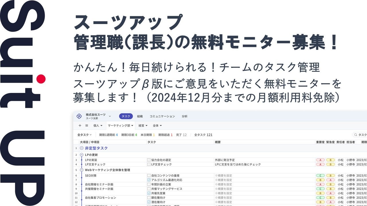 株式会社スーツ(所在地:東京都千代田区、代表取締役社長CEO:小松 裕介)は、チームでかんたん、毎日続けられるプロジェクト・タスク管理ツールの経営支援クラウド「Suit UP」(スーツアップ)の管理職で課長職の方の無料モニターを募集いたします。