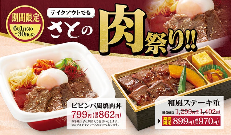 今回のキャンペーンでは、人気の「和風ステーキ重」を432円引きの特別価格970円で販売するほか、これからの季節にぴったりな「ビビンバ風焼肉丼 862円」は、コチュジャンソースがアクセントで楽しめる新商品です。