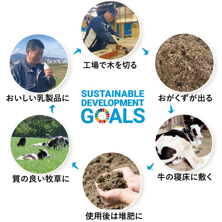 当社は地産地消に取り組む地元の酪農家の方々に活用していただきたいと、自社工場の製造過程で出たおがくずの無償提供を継続しております。提供したおがくずはまず牛舎に運ばれ、牛床に撒かれます。牛は糞尿でじめじめした場所で育てるとストレスから病気になりやすく、常に牛床を乾燥させておくことが良い牛の飼育条件とのこと。おがくずは糞尿などの水分を吸収するので、サラサラした快適な牛床づくりに役立ちます。さらに、牛床としての役目を終えた後は糞尿の混ざったおがくずを乾燥・発酵させ、牧草や畑の肥料として活用しています。本来廃棄となるおがくずが新たな用途で活用されるこのような取組みを50年に渡り継続して参りました。