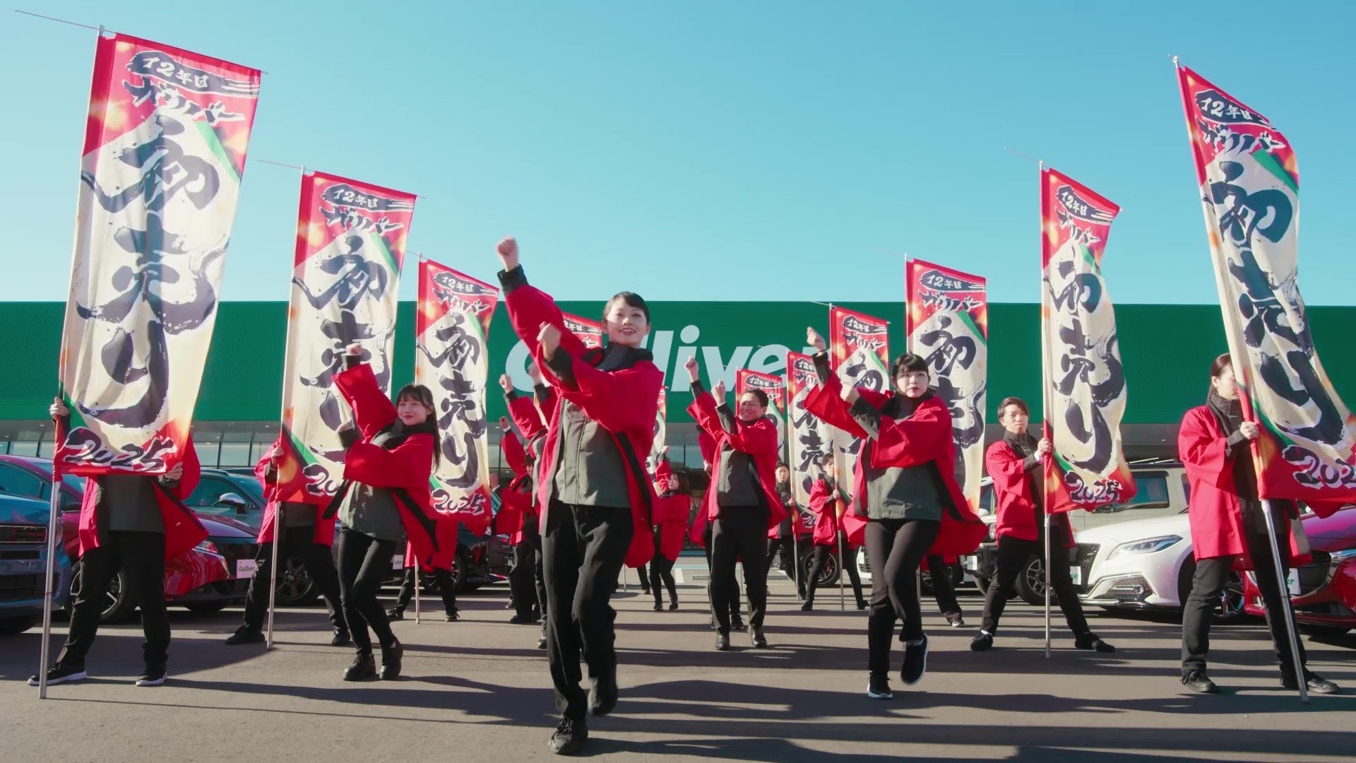 ガリバーの大型店舗で撮影された今回のCMは、ずらりと並んだ展示車両とお店のシンボルのひとつでもある、のぼりに焦点を当て「史上最大の初売り」のスケール感を表しています。また、スタッフがお客様をおもてなしする姿勢や、1年で1番にぎわう1月の(※2)初売りを盛り上げよう!という気持ちを、威勢の良いダンスで表現しました。お正月の華やかさを感じさせつつ、ボルテージが上がっていくようなオリジナルソングにも注目です♪