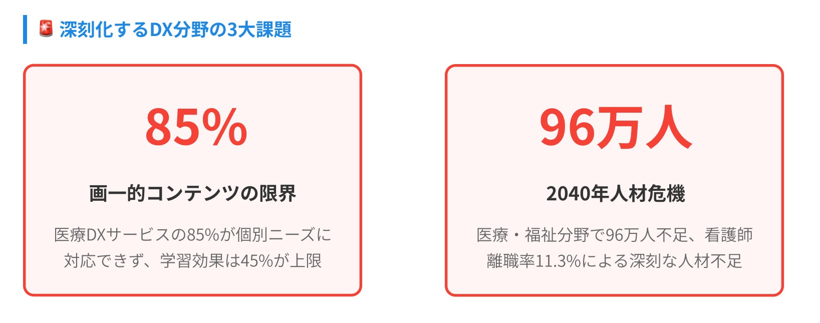 医療、産業、教育の各分野でデジタルトランスフォーメーション(DX)が加速する一方、多くのDXサービスが、全員に同じ内容を提供する「画一的なコンテンツ提供」に留まり、十分な学習効果や治療効果を出せていない、