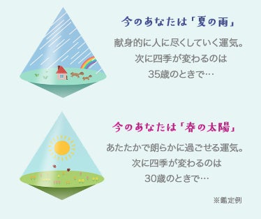 運景とは水晶玉子さんのオリジナル占術のひとつで、木・草・太陽・灯火・山・畑・岩・宝・海・雨の10タイプと春夏秋冬の掛け合わせで運勢を占います。また、占いから導き出すエネルギー値を円錐の長さや太さ、移り変わっていく四季を用いたイラストで表現し、あなたの運勢をより分かりやすい形でお伝えいたします。