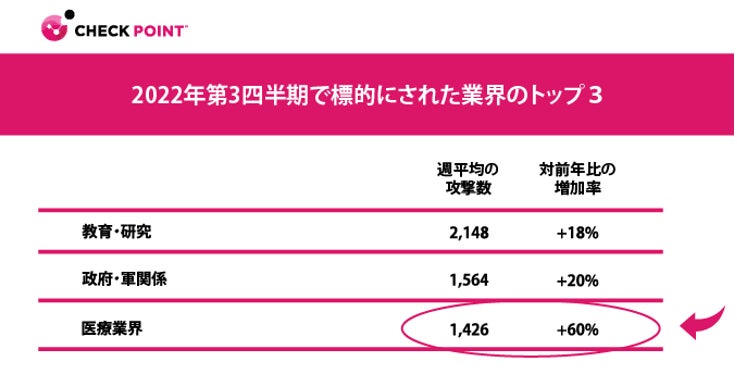 包括的なサイバーセキュリティソリューションプロバイダーであるチェック・ポイント・ソフトウェア・テクノロジーズ(Check Point® Software Technologies Ltd.、NASDAQ: CHKP、以下チェック・ポイント)の脅威インテリジェンス部門であるチェック・ポイント・リサーチ(Check Point Research、以下CPR)は、2022年第3四半期(7月〜9月)のサイバー攻撃の動向調査で、最もランサムウェア攻撃の標的とされたのは医療業界であることを明らかにしました。また、ランサムウェアに限らずサイバー攻撃全体で、最も狙われた業界としては医療業界は3位となりました。