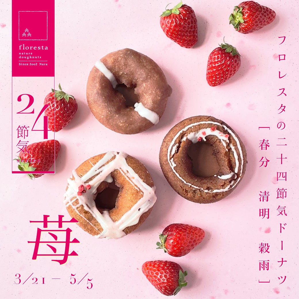 株式会社フロレスタ(本社:大阪市浪速区/代表取締役社長:辻尾吉厚)は、旬を味わう二十四節気ドーナツ「苺」を3月21日(火)の春分から販売しております。