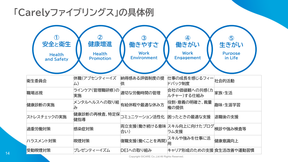 参考:健康経営のフレームワーク「Carely Five Rings(ケアリィファイブリングス)」