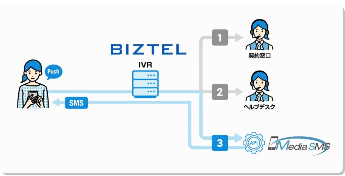 今回のシステム連携により、BIZTELを導入している企業は、IVR(音声ガイダンス)を通じて、顧客に対しSMSを送信することができるようになるなど、受電以外の応対フローに誘導することが可能になります。