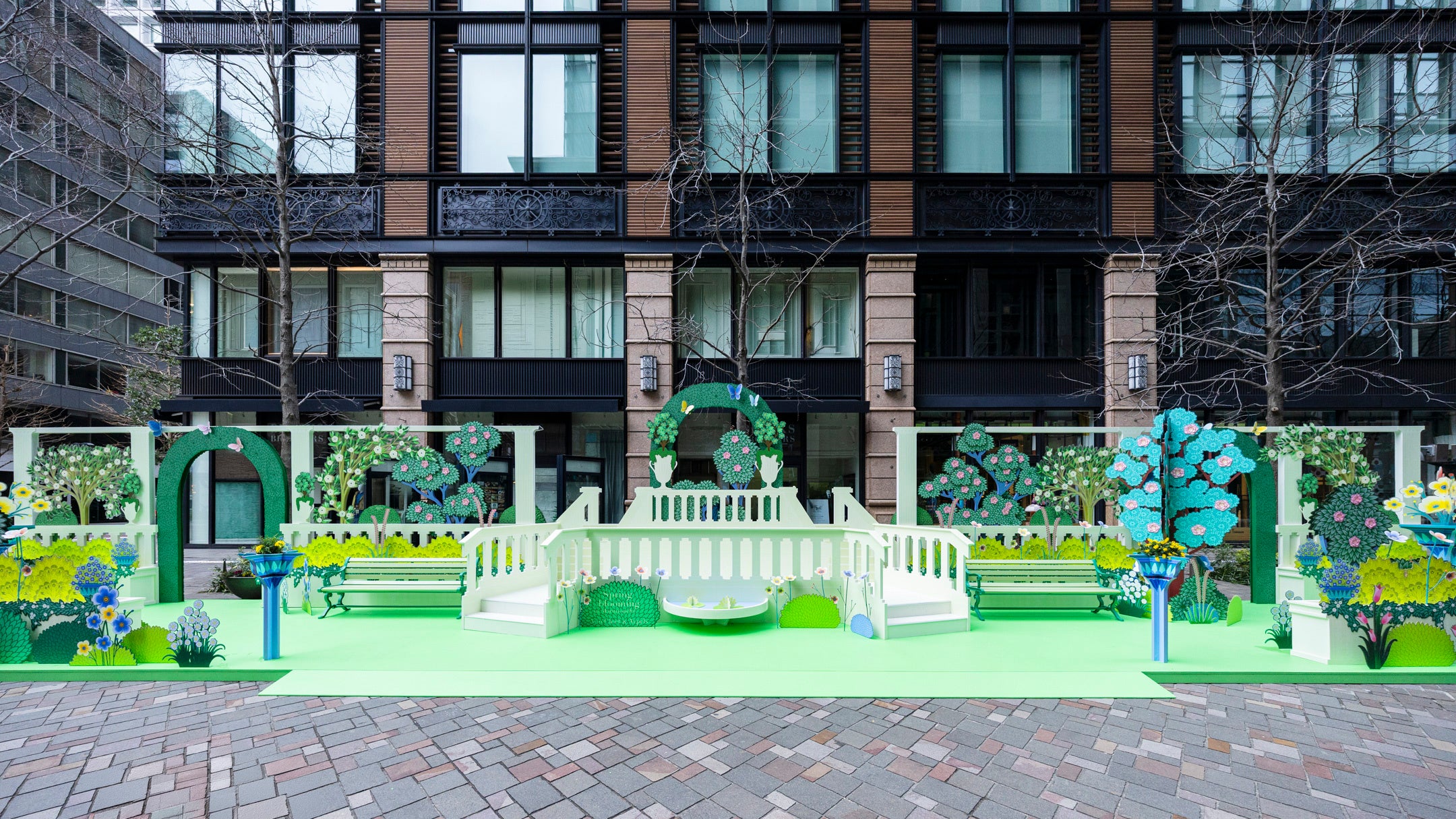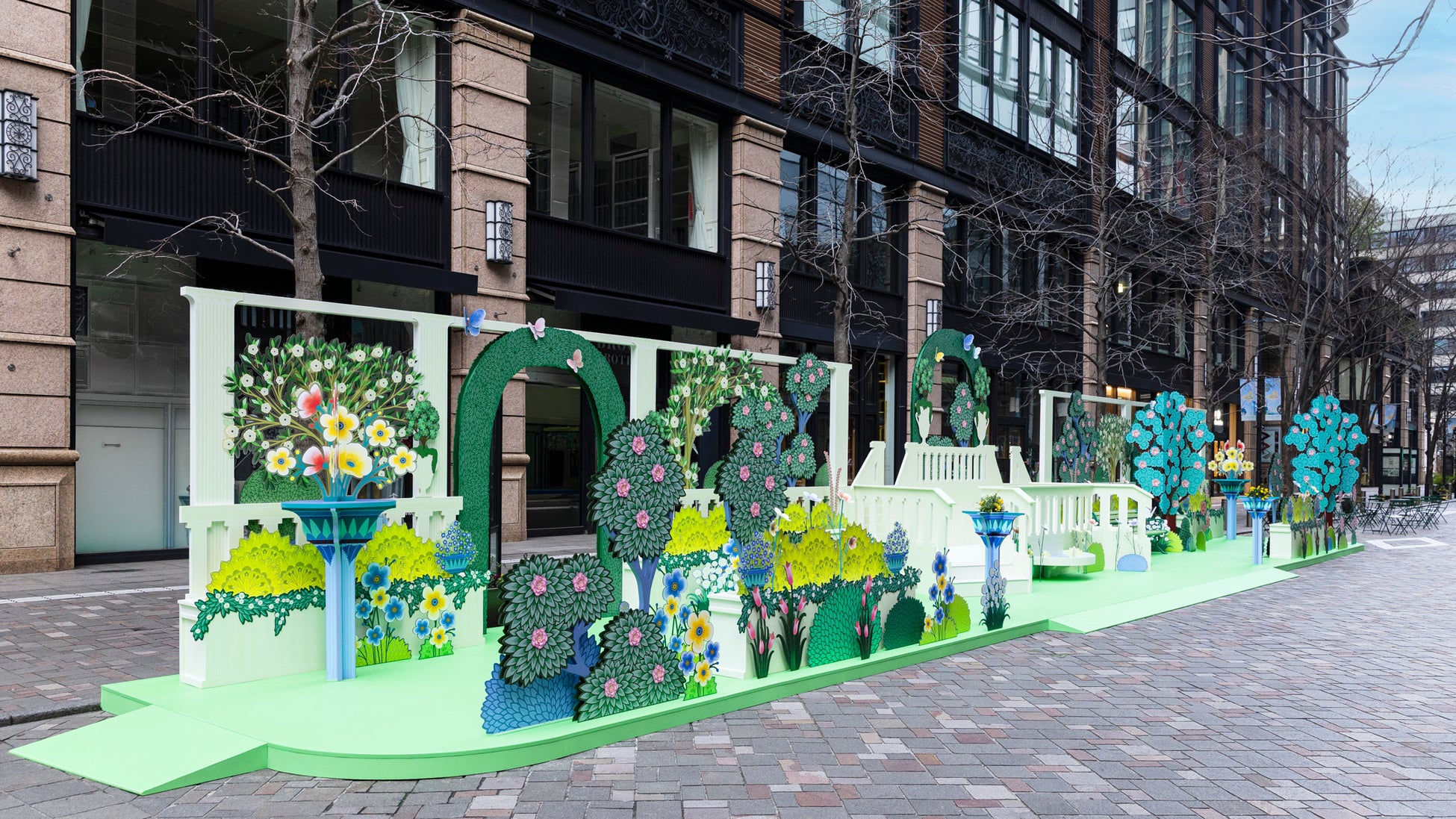 主人公は、春の訪れを告げる風に舞い、生命の喜びを謳歌するパピヨン(蝶々)です。東京の歴史と文化、日本経済の中心地である大丸有エリアに位置する丸の内仲通りを舞台に、4月5日(日)まで、メゾンにとって特別な季節の到来を祝福します。ガストーが創造する詩的な世界には、色とりどりの花々が咲きあふれ、蝶々が優美なダンスを繰り広げます。架空の湖のほとりには美しい動物たちが集い、道行く人々もベンチやブランコで憩いのひと時を過ごします。そこはまるで都心に出現した幻想の庭園、集う人々の対話から新たな物語が紡がれます。