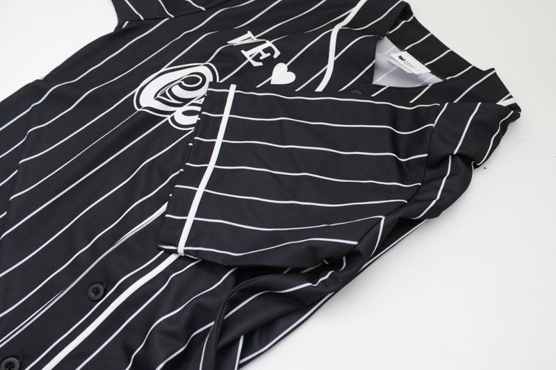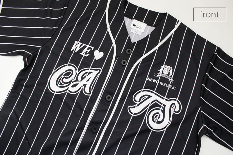 「WE♡CATS」が胸にプリントされたベースボールユニフォームシャツ。