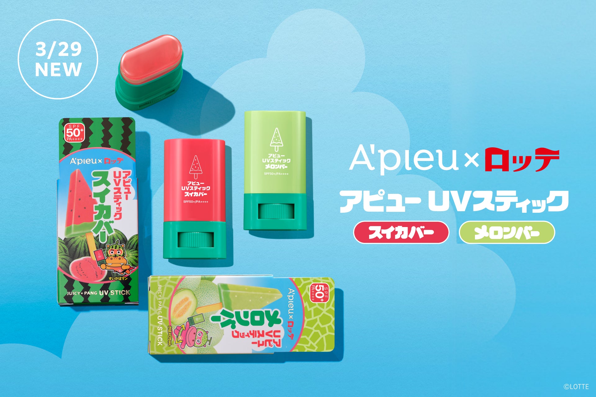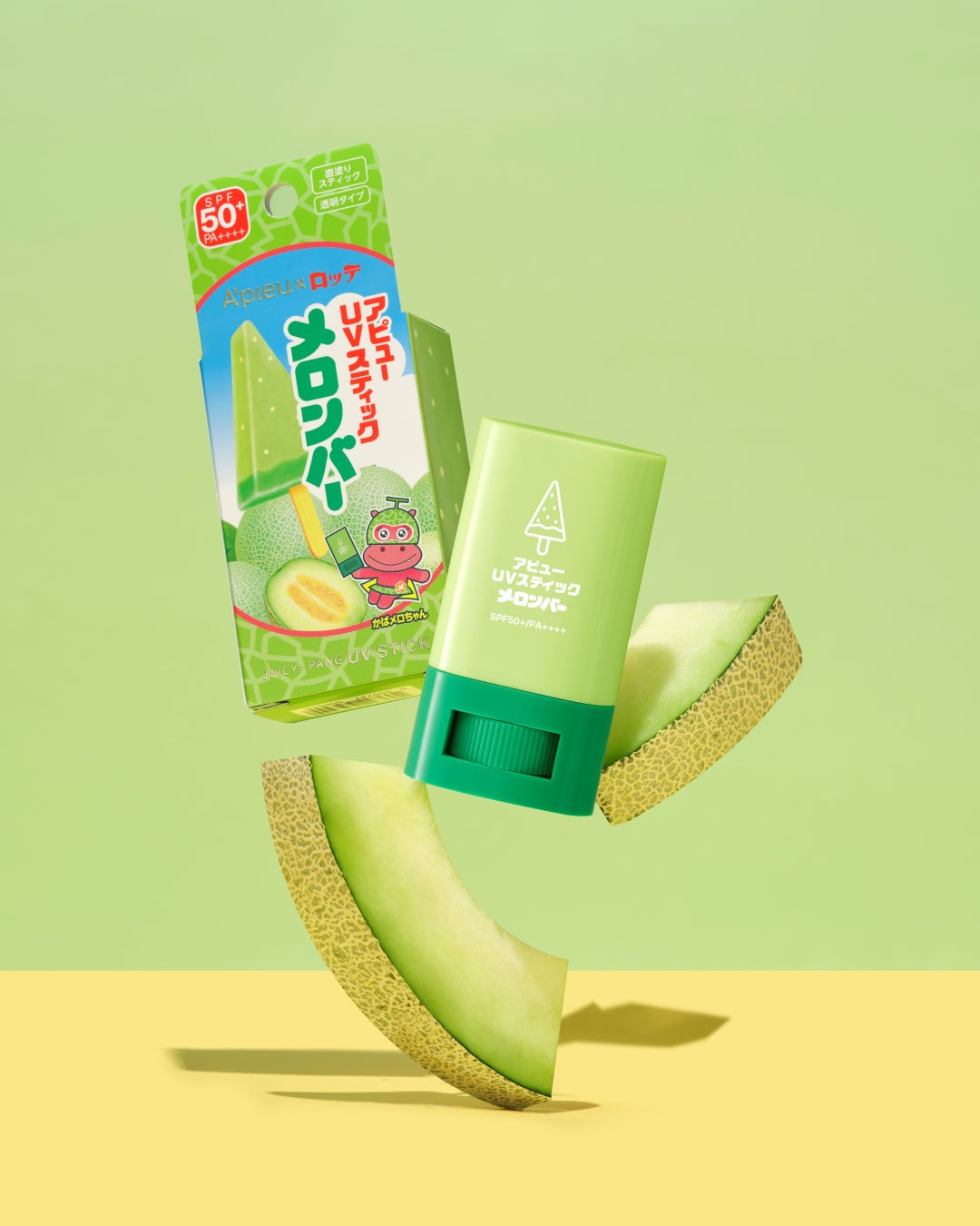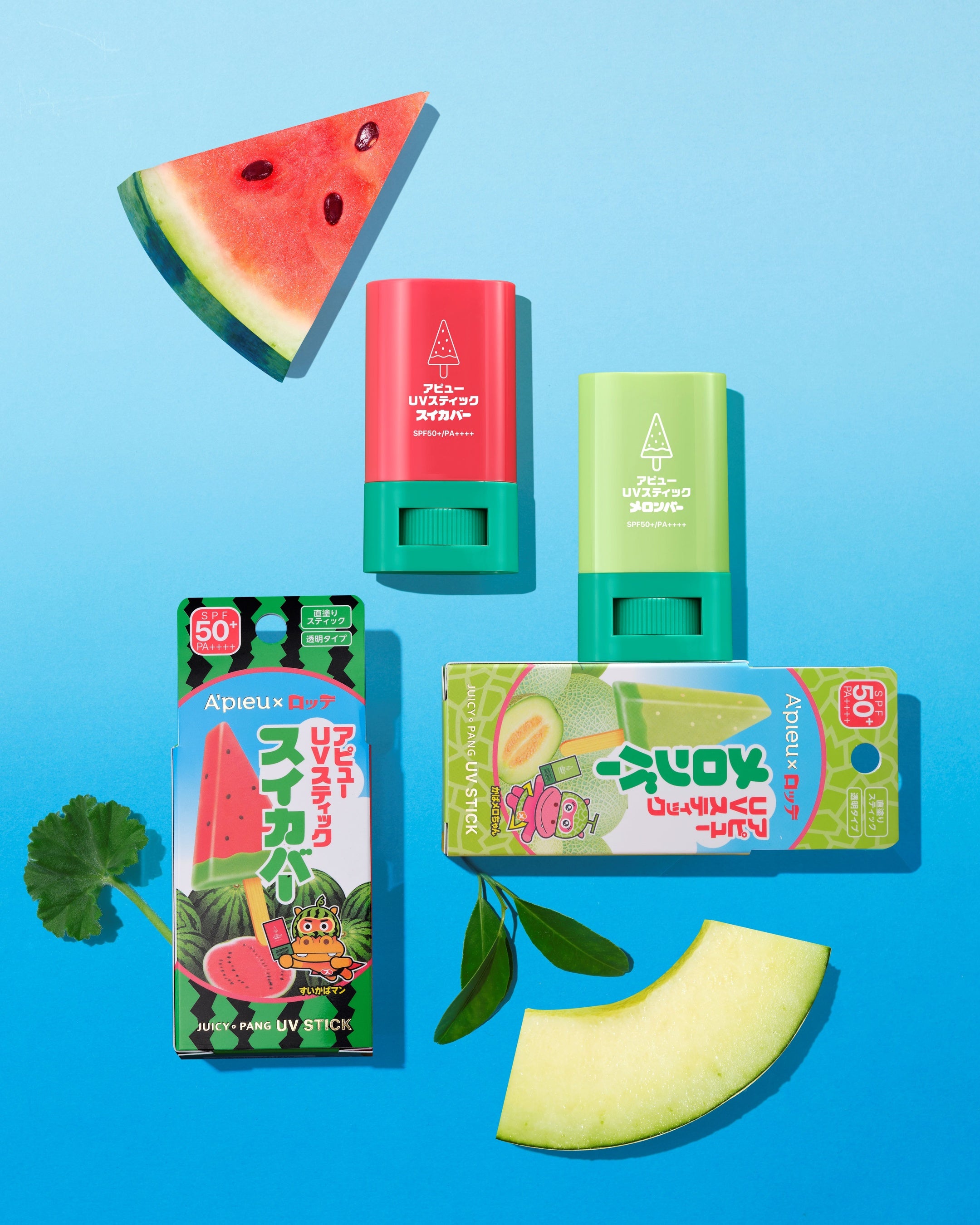 アピュー×ロッテ あの「スイカバー」「メロンバー」と限定コラボ! 「アピュー ジューシーパン UVスティック」ほんのり甘い香りまで再現でUVケアをもっと楽しく!
