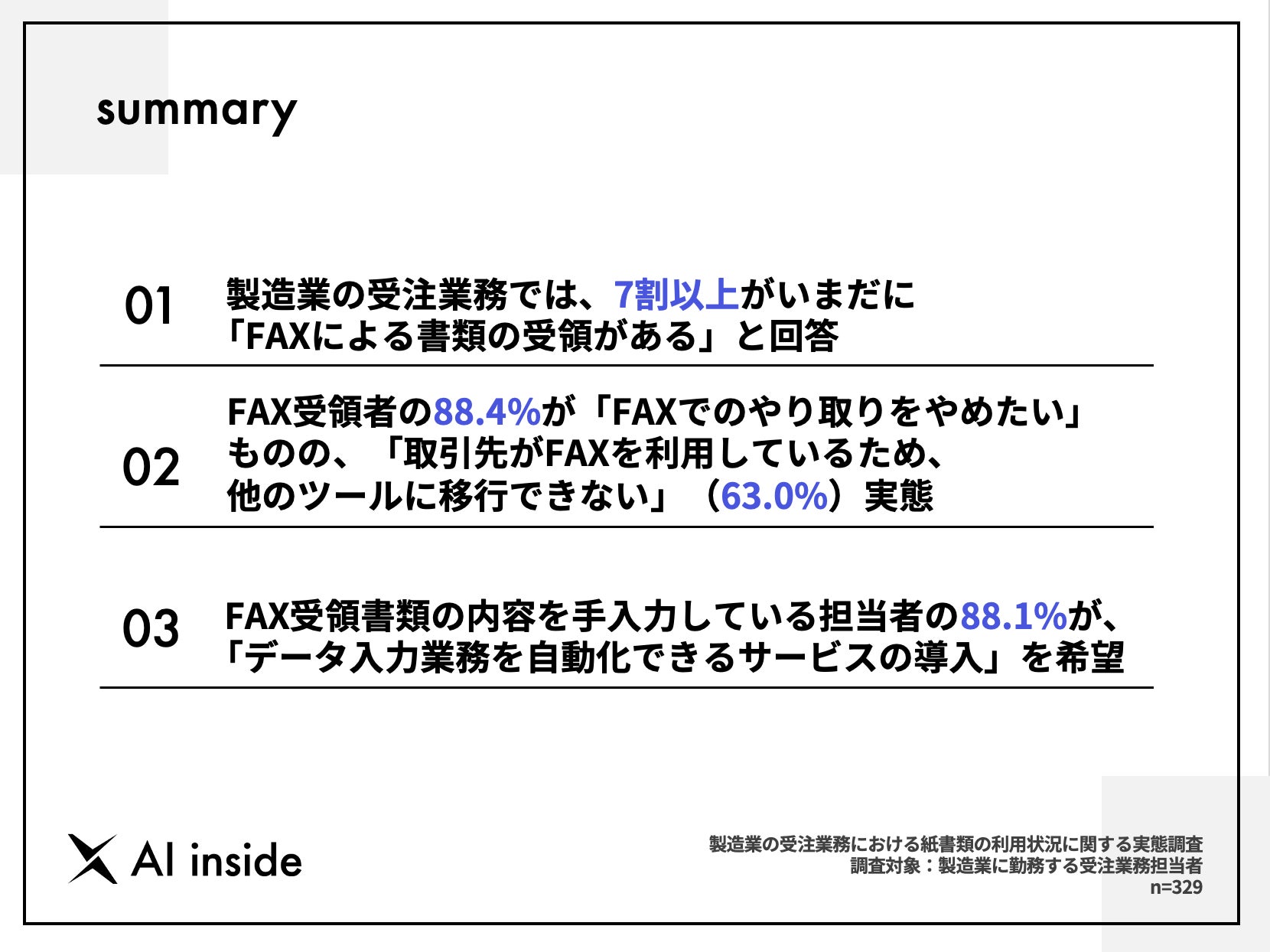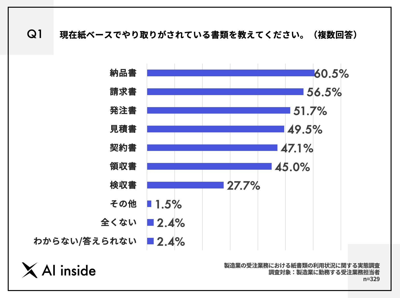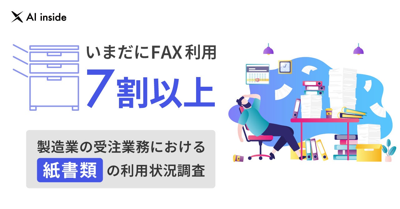 AIプラットフォームを提供するAI inside 株式会社(代表取締役社長CEO:渡久地 択、本社:東京都渋谷区、以下「AI inside」)は、日本を支える一大産業である製造業におけるデジタル化の実態を把握するべく、製造業に勤務する受注業務担当者329名を対象に、受注業務における紙書類の利用状況に関する実態調査を実施しました。