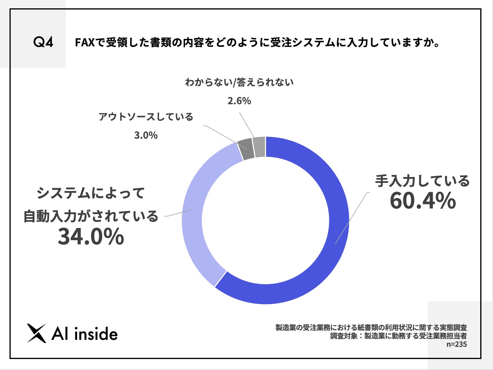 Q2で「かなりある」「ややある」と回答した方に、「Q4.FAXで受領した書類の内容をどのように受注システムに入力していますか。」(n=235)と質問したところ、「手入力している」が60.4%、「システムによって自動入力がされている」が34.0%の回答となりました。