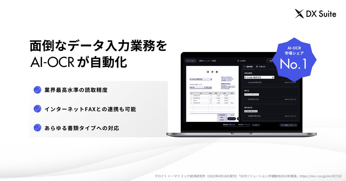 「DX Suite」は、これまで手入力で行っていた様々な書類のデータ化を大幅に効率化し、あらゆる企業・団体の生産性向上とデータマネジメントの高度化に貢献します。