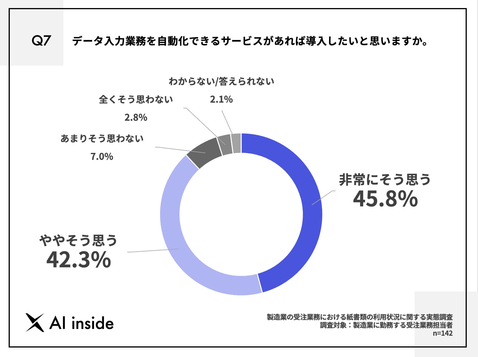 Q4で「手入力している」と回答した方に、「Q7.データ入力業務を自動化できるサービスがあれば導入したいと思いますか。」(n=142)と質問したところ、「非常にそう思う」が45.8%、「ややそう思う」が42.3%の回答となりました。