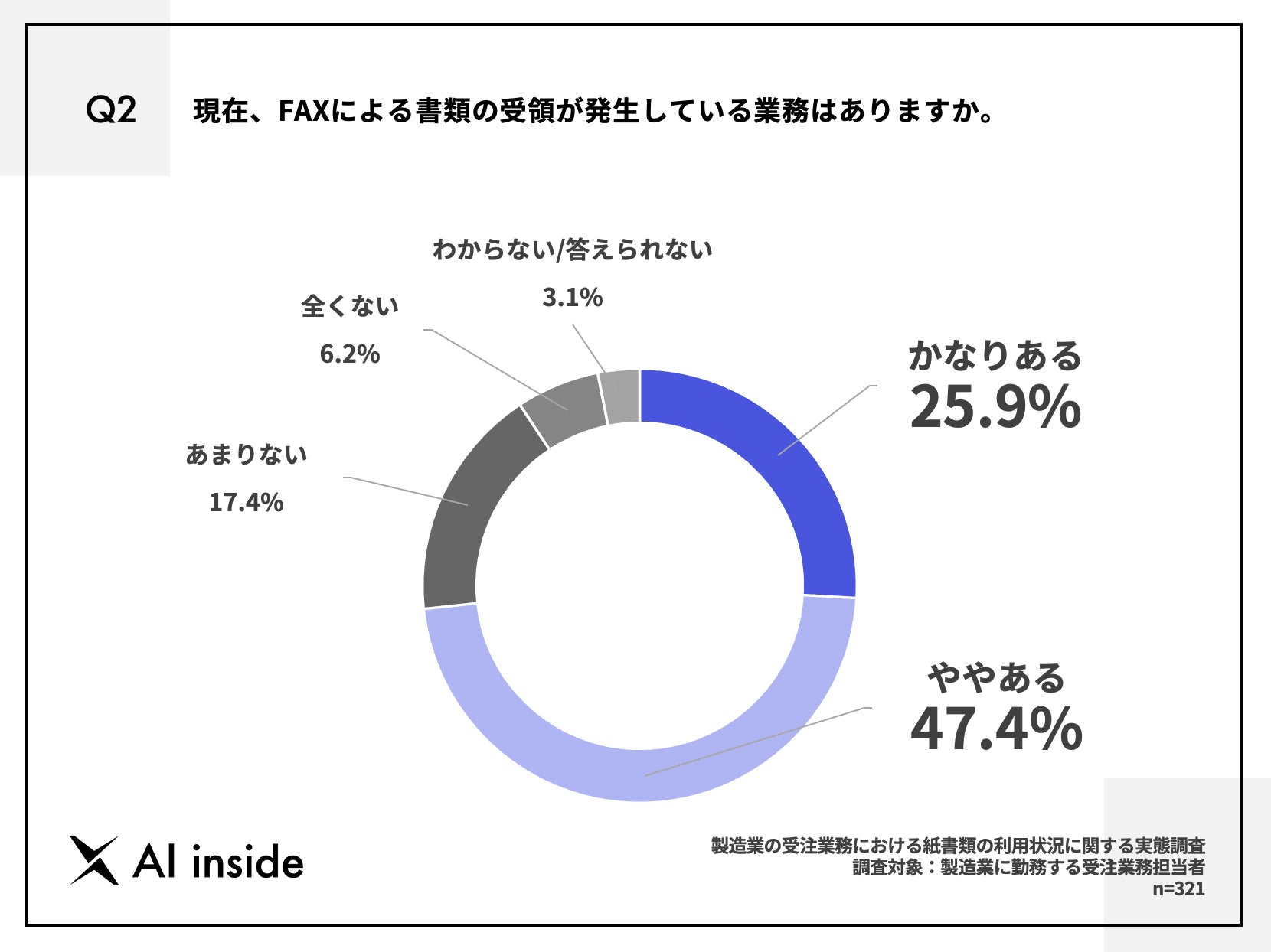 Q1で「全くない」以外を回答した方に、「Q2.現在、FAXによる書類の受領が発生している業務はありますか。」(n=321)と質問したところ、「かなりある」が25.9%、「ややある」が47.4%の回答となりました。