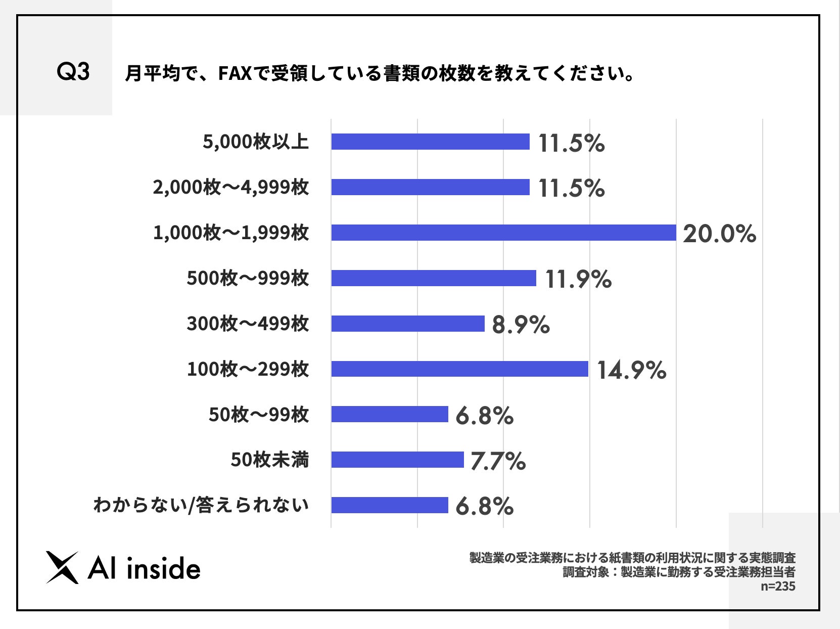 Q2で「かなりある」「ややある」と回答した方に、「Q3.月平均で、FAXで受領している書類の枚数を教えてください。」(n=235)と質問したところ、「5,000枚以上」が11.5%、「2,000枚~4,999枚」が11.5%、「1,000枚~1,999枚」が20.0%の回答となりました。