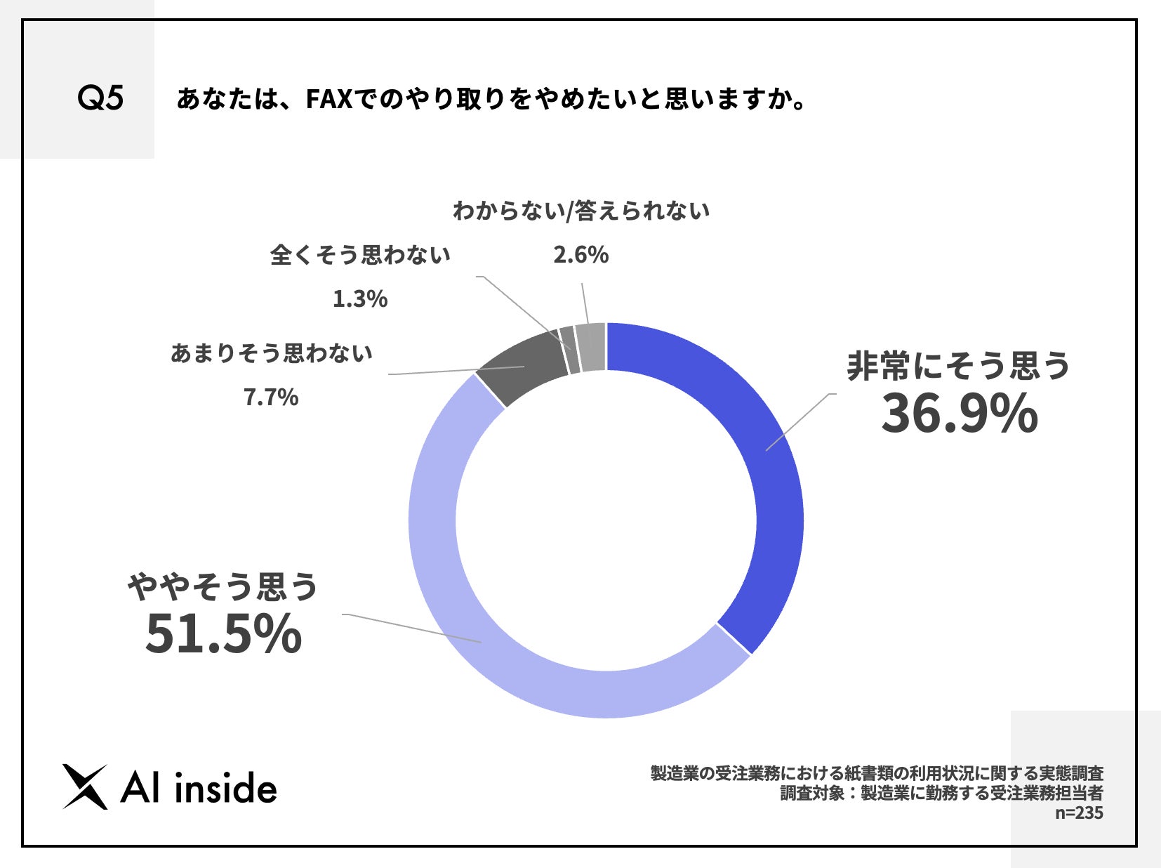 Q2で「かなりある」「ややある」と回答した方に、「Q5.あなたは、FAXでのやり取りをやめたいと思いますか。」(n=235)と質問したところ、「非常にそう思う」が36.9%、「ややそう思う」が51.5%の回答となりました。