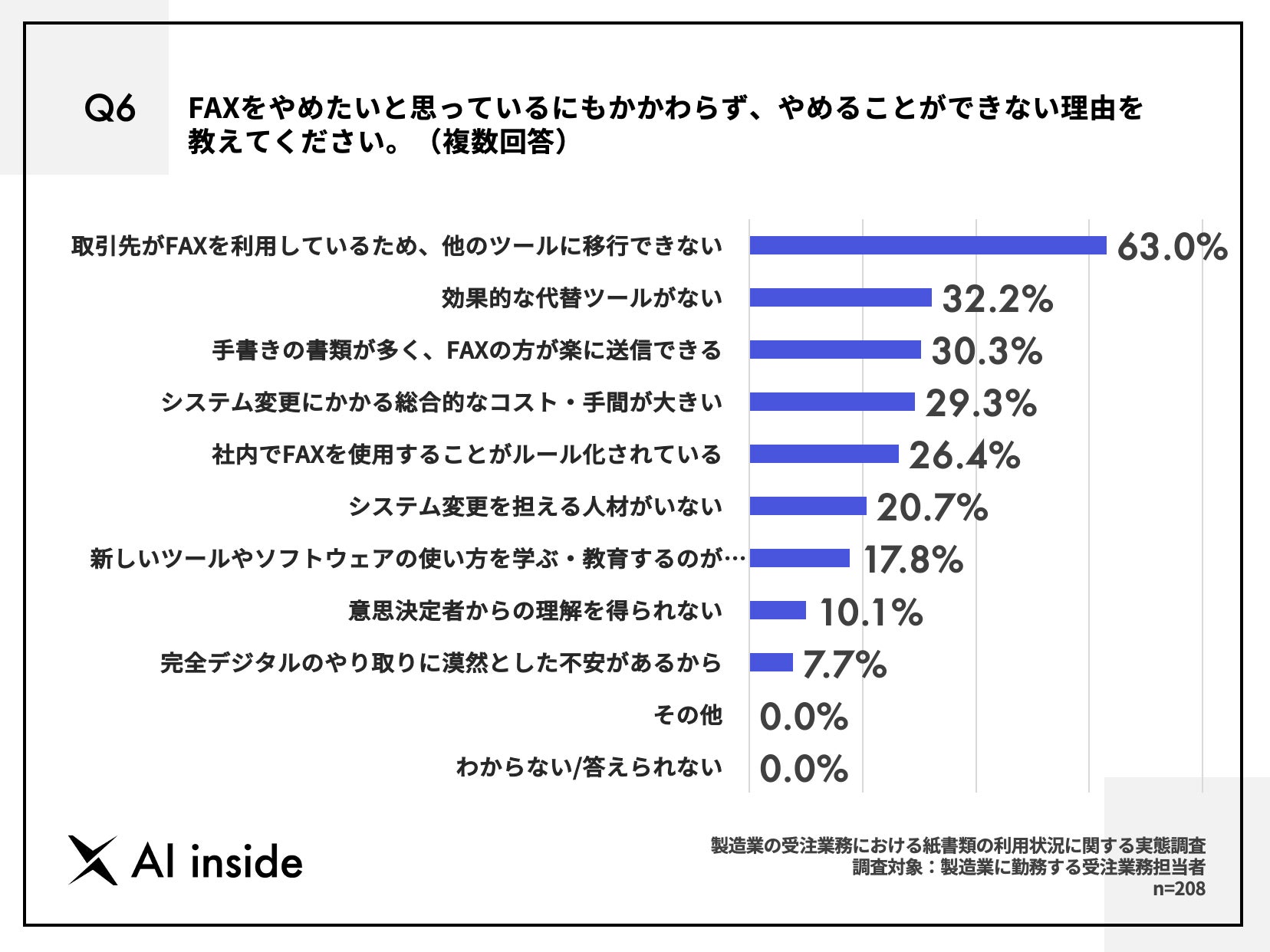 Q5で「非常にそう思う」「ややそう思う」と回答した方に、「Q6.やめたいと思っているにもかかわらず、やめることができない理由を教えてください。(複数回答)」(n=208)と質問したところ、「取引先がFAXを利用しているため、他のツールに移行できない」が63.0%、「効果的な代替ツールがない」が32.2%、「手書きの書類が多く、FAXの方が楽に送信できる」が30.3%の回答となりました。