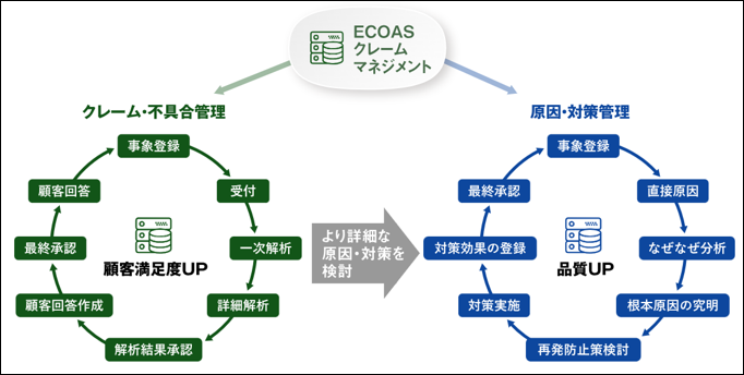 ECOAS クレームマネジメント for SaaSは、クレーム対応における「クレーム・不具合管理」および「原因・対策管理」を効率化するクラウド型のワークフローシステムです。「クレーム・不具合管理」ではクレーム受付から顧客回答までを、「原因・対策管理」では原因究明から対策実施までをシステム上で一元管理し、関連部門で情報共有しながら迅速かつ効果的に進めることが可能で、顧客満足度の向上とサービス品質の改善に貢献します。