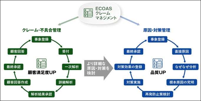 ECOASは、業務効率の向上やビジネスの加速化を支援するソリューションシリーズです。今回リリースするECOAS クレームマネジメント for SaaSは、「お客様の声を品質向上の資産に変える」というコンセプトで作成された、クレームの発生からお客様への回答と再発防止策の効果検証までをトータルにサポートするパッケージ製品です。クレームを一過性のものにするのではなく、管理蓄積し、クレーム改善のPDCAを回しながら社員一丸となって対応を進めることで、クレーム情報を資産として有効活用できます。