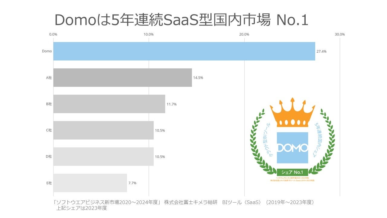 SaaS型データ活用プラットフォーム「Domo」を提供するドーモ株式会社(本社:東京都渋谷区、プレジデント ジャパンカントリーマネージャー:川崎友和、以下ドーモ)は、株式会社富士キメラ総研(本社:東京都中央区、以下富士キメラ総研)が2024年7月に刊行した市場調査レポート「ソフトウェアビジネス新市場 2024年版」において、SaaS型BIツール国内市場シェアNo.1(2023年度)を獲得しました。これにより2019年度から5年連続で、SaaS型BIツールの国内市場シェアNo.1※となりました。
