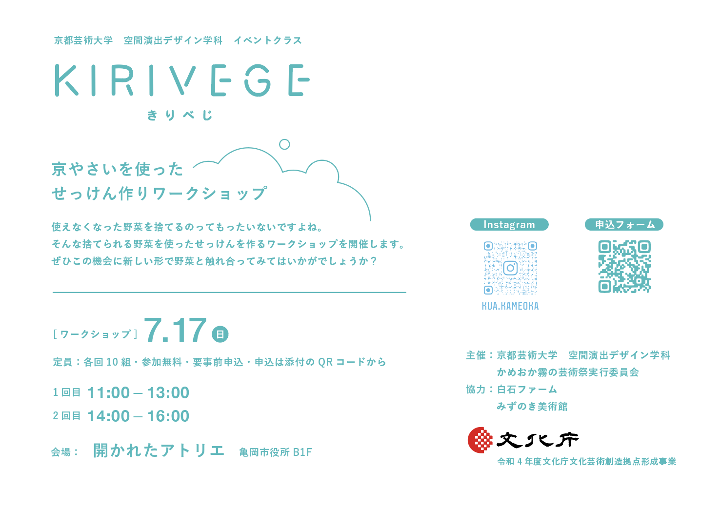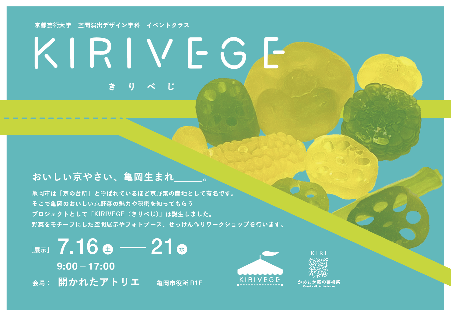 学校法人瓜生山学園 京都芸術大学(京都市左京区/学長 吉川左紀子)空間演出デザイン学科の3年生が、亀岡市役所の地下1階にある「開かれたアトリエ」というスペースで、7月16日(土)より亀岡の「京野菜」をテーマにしたイベント「KIRIVEGE(きりべじ)」を開催します。捨てられる資材で作った野菜のモチーフによる空間展示やフォトブース、廃棄野菜を用いたせっけん作りのワークショップを企画しました。