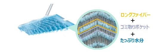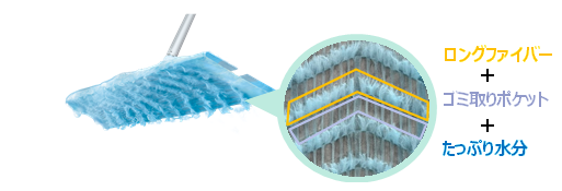 ・世界初※1の特許技術※2を採用した「ロングファイバー・ゴミ取りポケット」の起毛×水分たっぷりウェットシートにより、髪の毛や粒ゴミをしっかり絡めとりながら、ベタベタ汚れも拭き取ります。