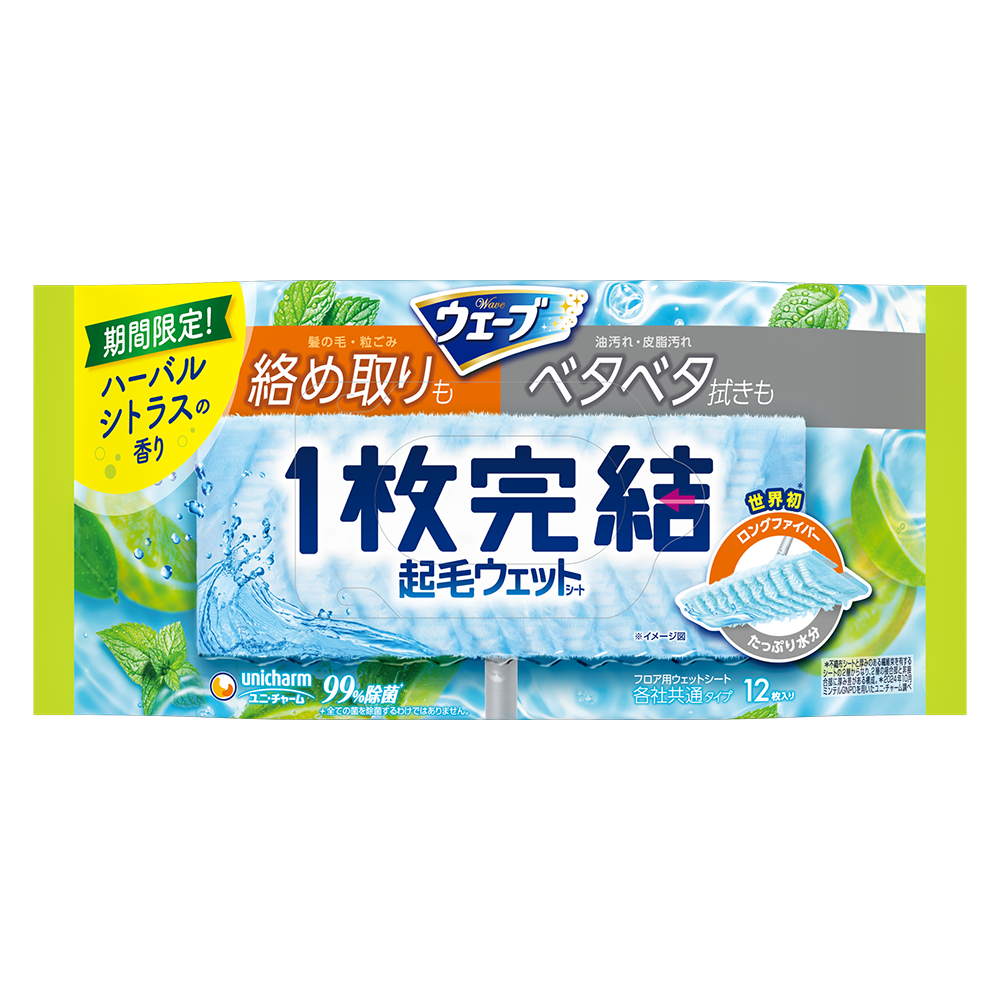 そこでこのたび、粒ゴミや髪の毛をしっかり絡め取りながら、ベタつき汚れも一度で拭き取れる、爽やかな香り付き『ウェーブ 1枚完結フロア用起毛ウェットシート ハーバルシトラスの香り』を発売します。
