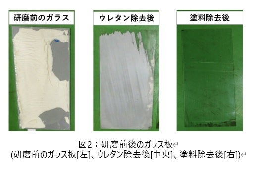 今回新たに開発した「ガラス研磨システム」は、このガラス板を研磨して付着したウレタンや塗料などをきれいに除去します。これにより、同じガラス素材としての利用(水平リサイクル)が可能になり、分離したガラス板の用途が広がりました。