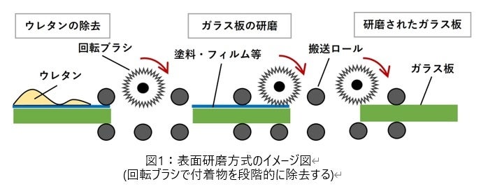 今回新たに開発した「ガラス研磨システム」は、複数の回転ブラシでガラス板の表面を研磨して付着物を除去する「表面研磨方式」(図1)を採用しました。ガラス板の投入角度やブラシの回転などを組み合わせて研磨することで、ウレタンや塗料などの付着物を除去する事が可能(図2)となりました。また回収された冷蔵庫は、それぞれガラス板の幅が異なっており、幅が広いガラス板では付着物が残りやすい傾向にありましたが、さまざまな幅のガラス板に対応できるように、回転ブラシを段階的に設置して付着物を除去する構造になっています。