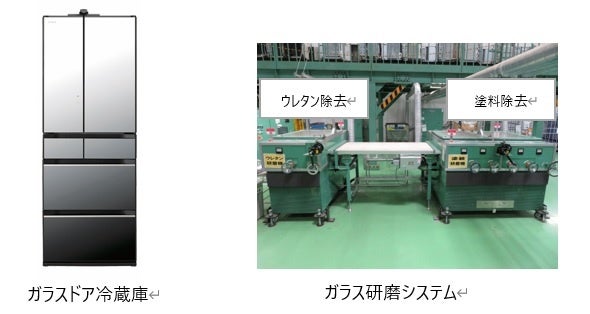 ガラスドア冷蔵庫を製造・販売している日立GLSでは、リサイクル処理におけるガラスドアのガラス板を効率よく分離、研磨し、再資源化をめざすための研究開発を進めており、2021年11月には「冷蔵庫ガラスドア分離装置」を開発しました。この装置では、ガラスドアをドア部分とガラス板に分離することで、ドア部分に使用されているプラスチックや金属などの再資源化を可能にしました。一方で、ガラス板については、塗料などが付着していたため、ガラス素材として再資源化することが困難で、路盤材など別素材として利用していました。