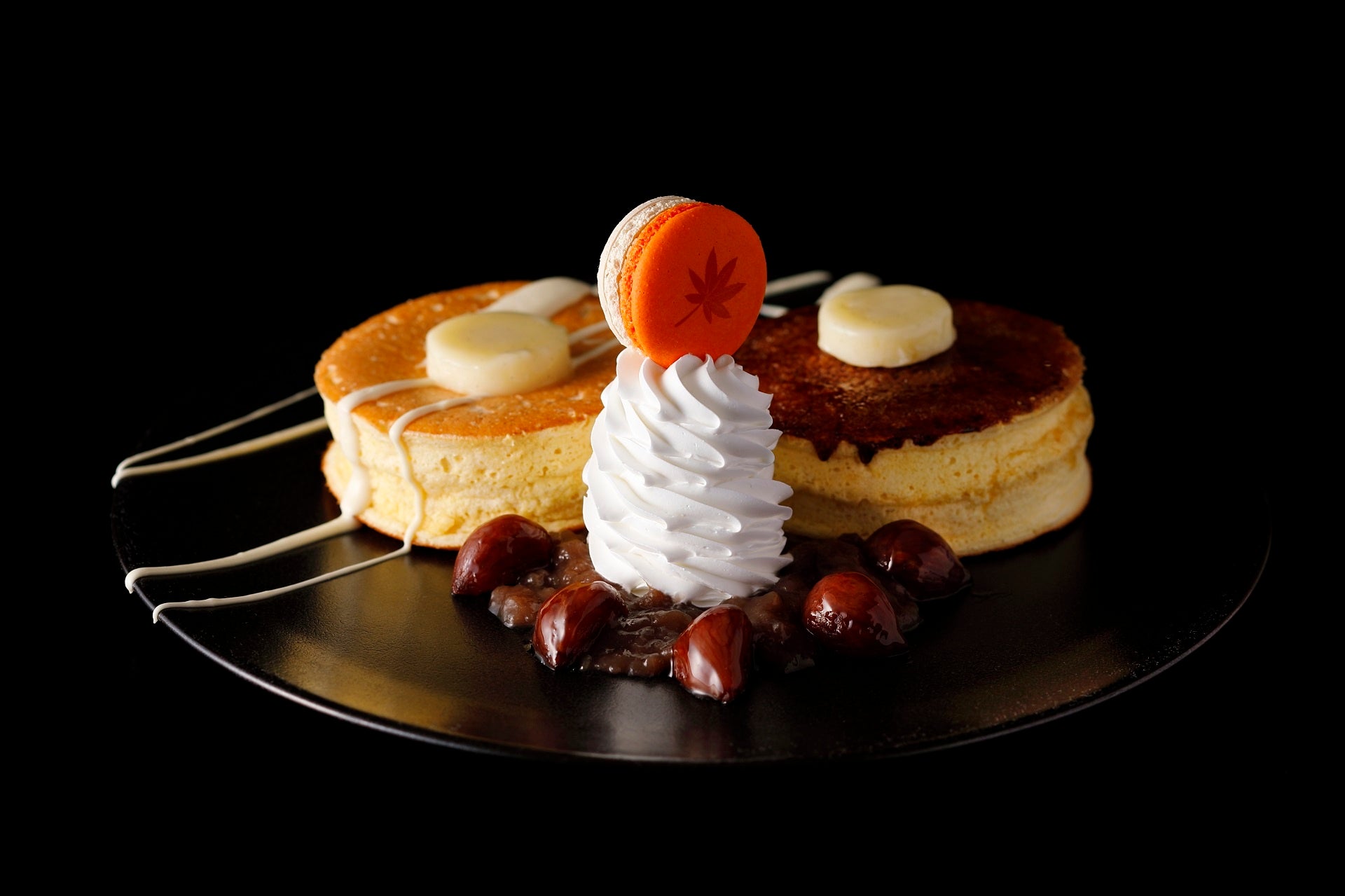 白あんがアクセントのマロンペーストをはさんだ“もみじマカロン”が秋らしさを表現しました。お好みで黒蜜をかけてお召し上がりください。