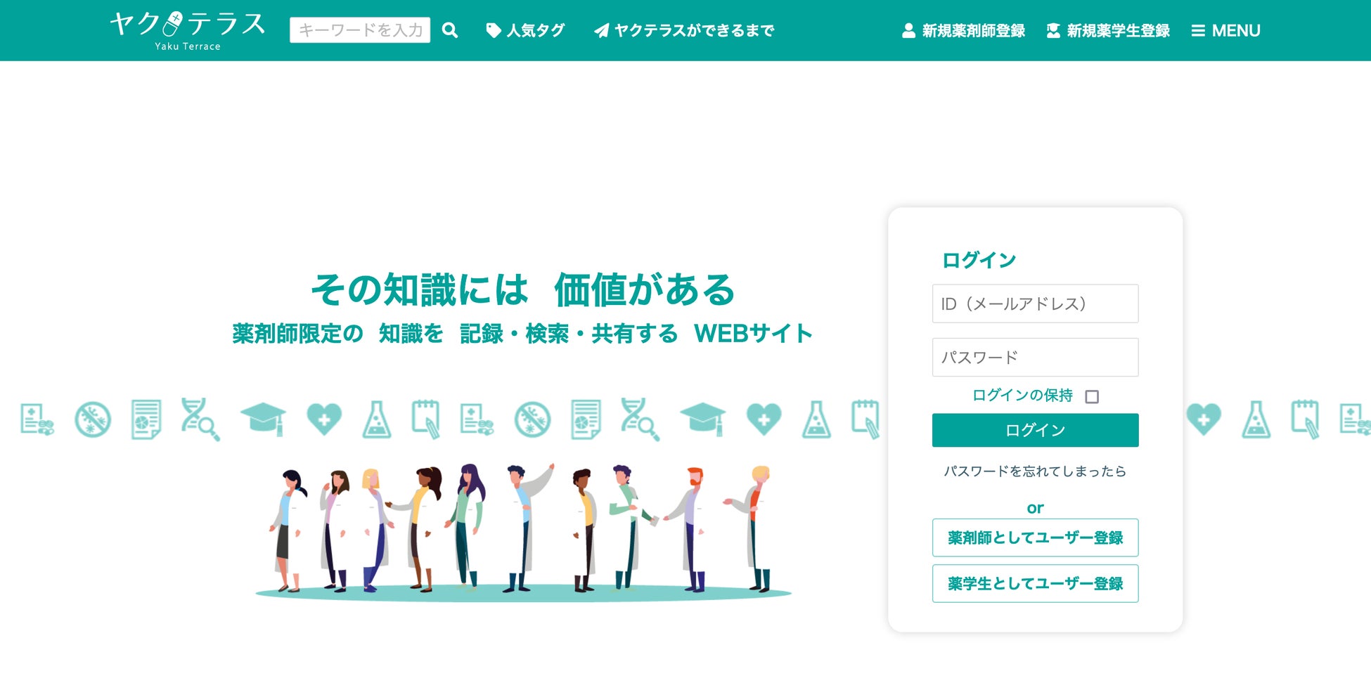 「ヤクテラス」は、薬剤師限定でご利用の出来る、日々の学び等の記録や気になる情報の検索、情報の共有などが出来るコミュニティサイトです。