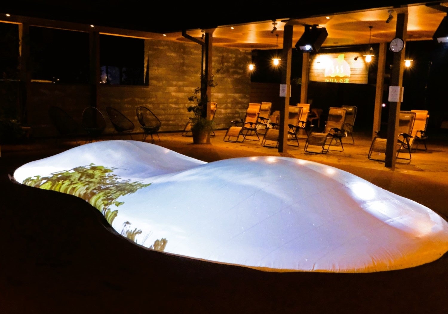 男女一緒に楽しめる「サウナガーデン」中央に設置された大型エア遊具「ふわふわドーム」に、光学機器メーカー株式会社ビクセンが監修し、星空写真家・タイムラプスクリエイターの成澤広幸氏が手がけた、香取市の星空タイムラプス映像を投影します。お子様と一緒に美しい映像を眺めながら外気浴が楽しめる、これまでにないサウナ空間が誕生しました。
