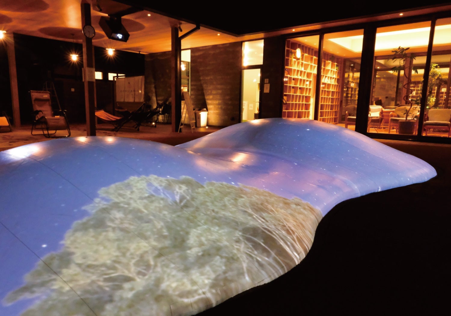 コンピュータ上でのブレンディング(映像のつなぎ目の調整)や実際の投影テストを重ねることで、「サウナガーデン」のどの位置から見ても美しい映像が楽しめる空間を作り出しました。
