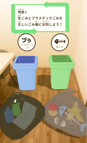 リサイクルARゲームは、ARで表示されるごみを正しいごみ箱へ分別するゲームです。正しく分別することでポイントがもらえます。