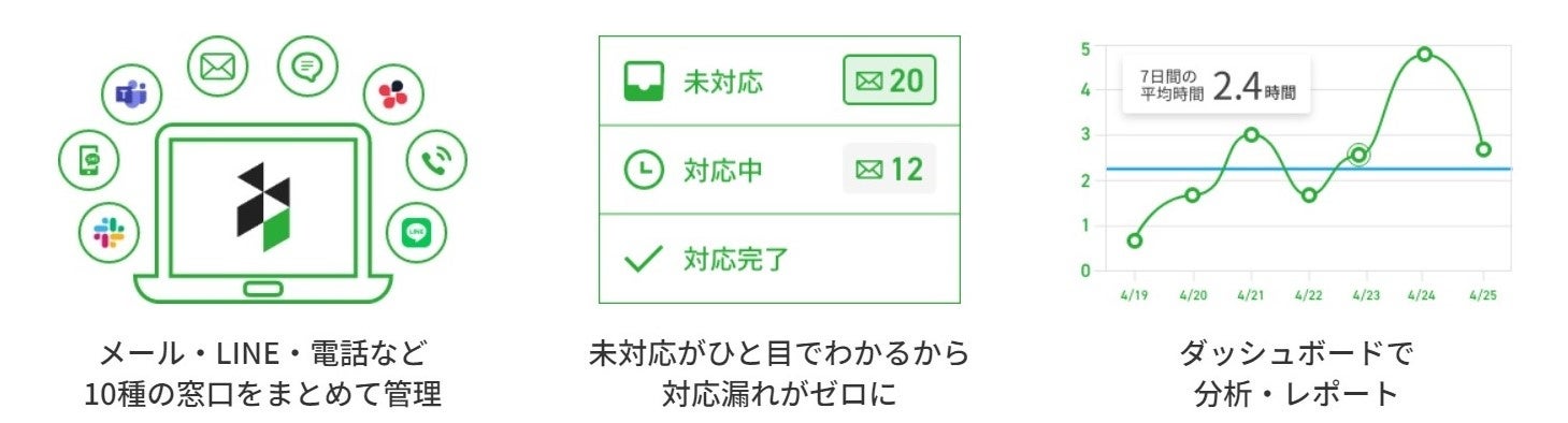 メール、電話、チャット、LINEなど多様化するコミュニケーションサービスを一つの画面に集約し、顧客との接点が増え複雑になった問い合わせを簡単に一元管理できます。さらに、二重返信や対応漏れを防止するステータス管理やWチェックが簡単にできる承認機能など、複数人での問い合わせ対応で生じがちな様々な課題を解決する機能を備えています。