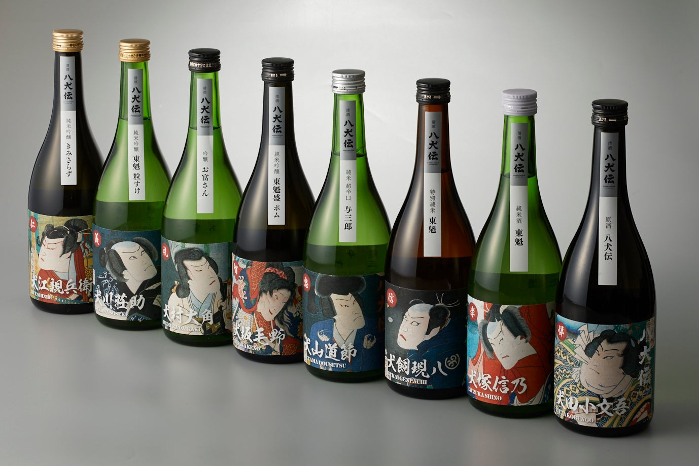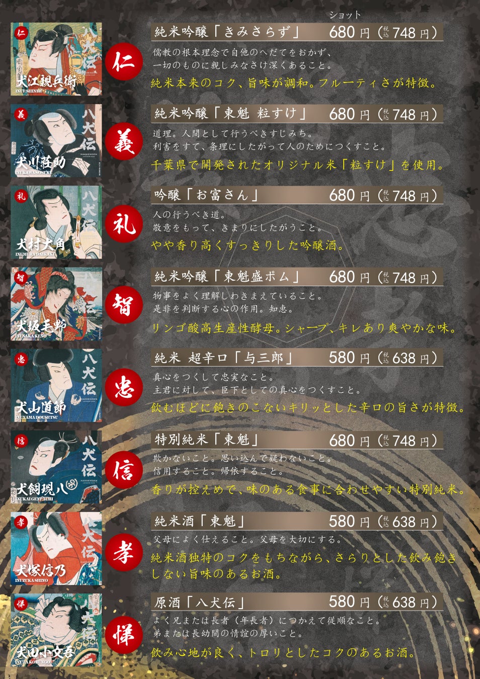今回ご提供するのは、ヤマトサカナオリジナルラベルの日本酒です(製造元:小泉酒造)。「南総里見八犬伝」に登場する8つの徳(仁・義・礼・智・忠・信・孝・悌)をテーマにラインナップされた、個性豊かな8種類の味わいを八剣伝でお楽しみいただけます。