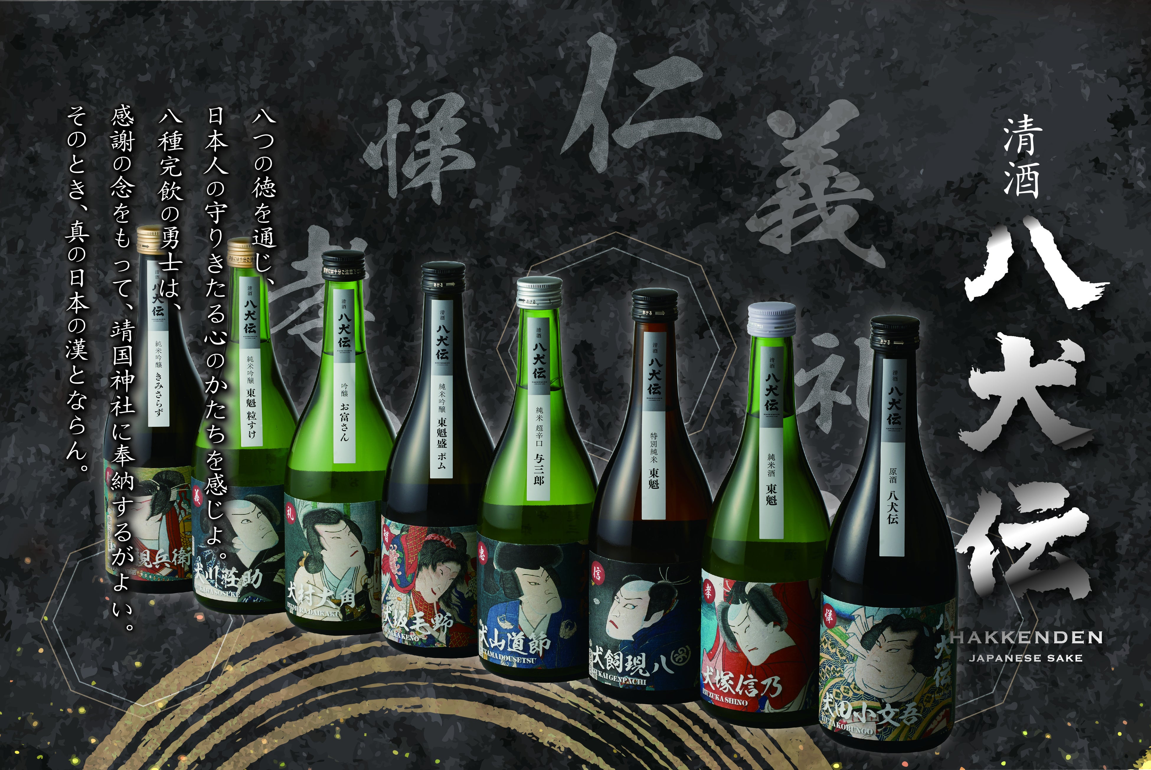 公式通販にて「清酒八犬伝 720ml×8種セット」販売中!5,000円以上購入で送料無料、先着100名様に錦絵ポストカード8枚セットをプレゼント!